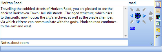 You notice the familiar room Name, Description, and Notes field. The Text/Exits/Appearance/Other/Contents/Scripts tabs are now on the right as just icons instead of taking up lots of screen space.